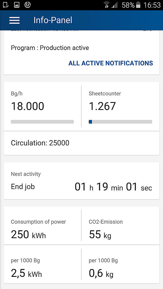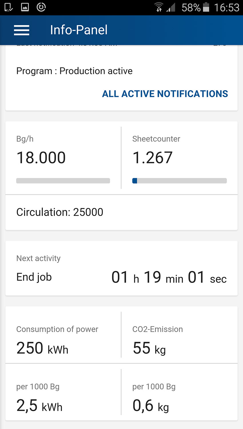 Operators are similarly more flexible than ever before when it comes to monitoring of the production process. They can now carry a mobile control console in their pocket. With a smartphone and the Rapida LiveApp, they are always in touch with their press – even while taking a coffee break in the canteen. A glance at the display provides details of the job which is currently in production and how much longer it will take to complete. The press crew can then decide at leisure when they need to be back at the press to load up the plates for the next job, for example.