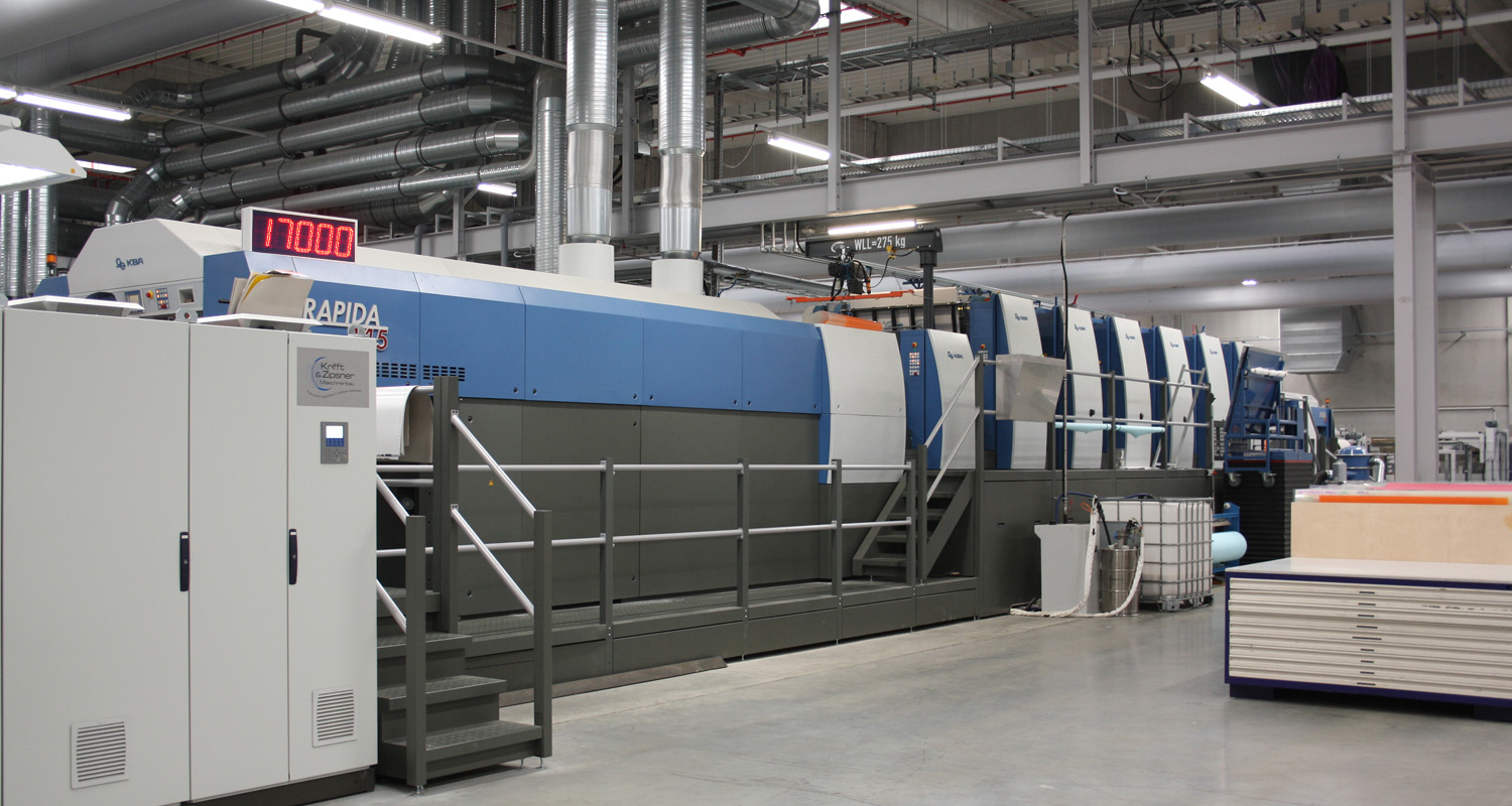 A new KBA Rapida 145 has already been taken into service, and further large-format Rapidas were relocated to Erlensee from the old print centre in Hanau. Before reinstallation, however, they were treated to a thorough overhaul and a number of state-of-the-art retrofits. All three presses are integrated into automatic logistics systems, which handle substrate transport along the whole chain from initial delivery through to post-press finishing and conversion.
